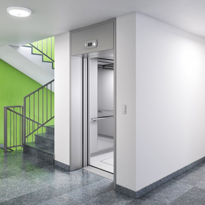 Przestronna klatka schodowa z windami
